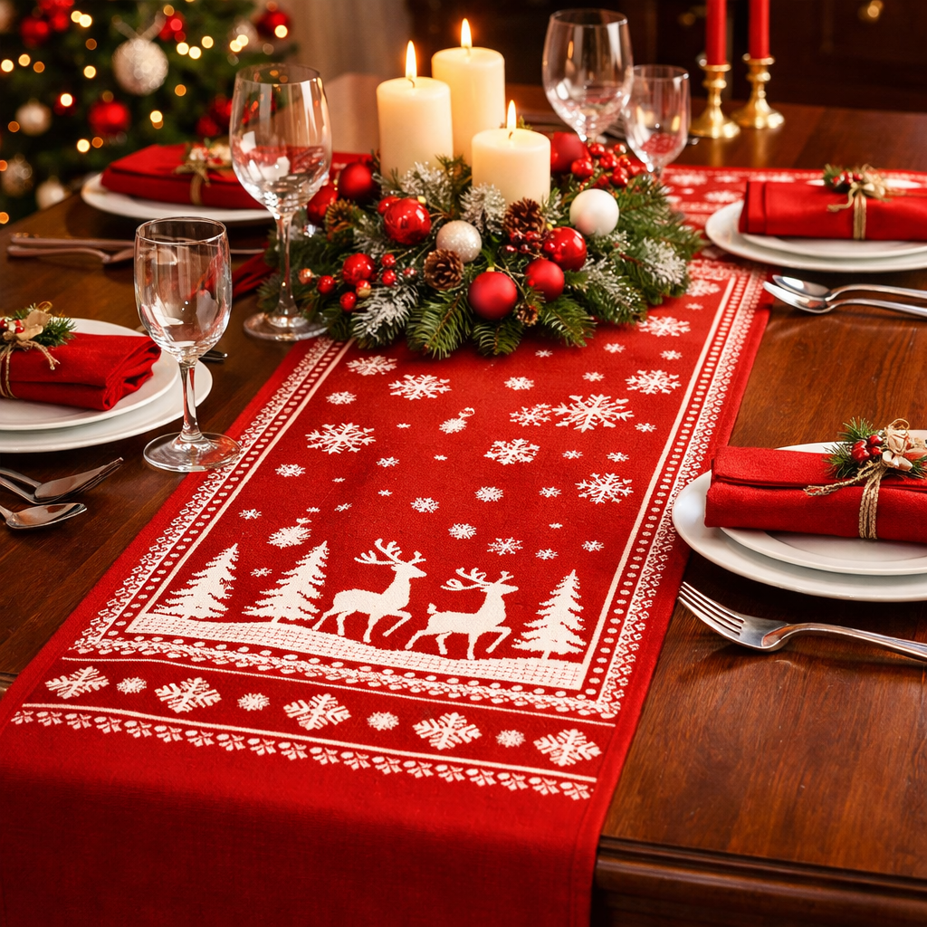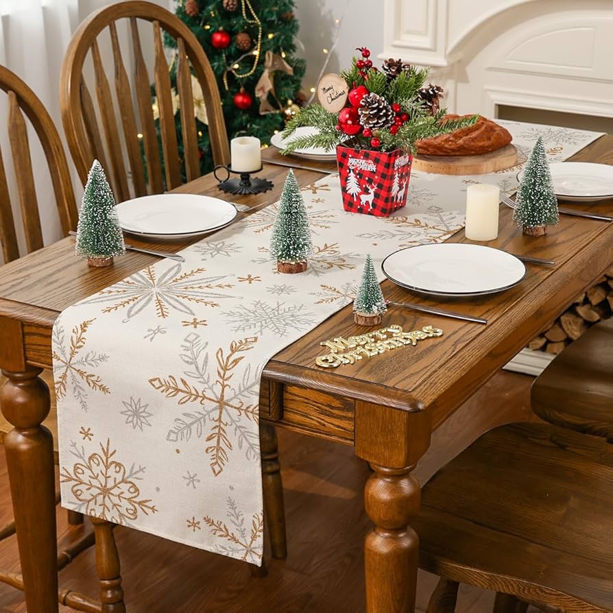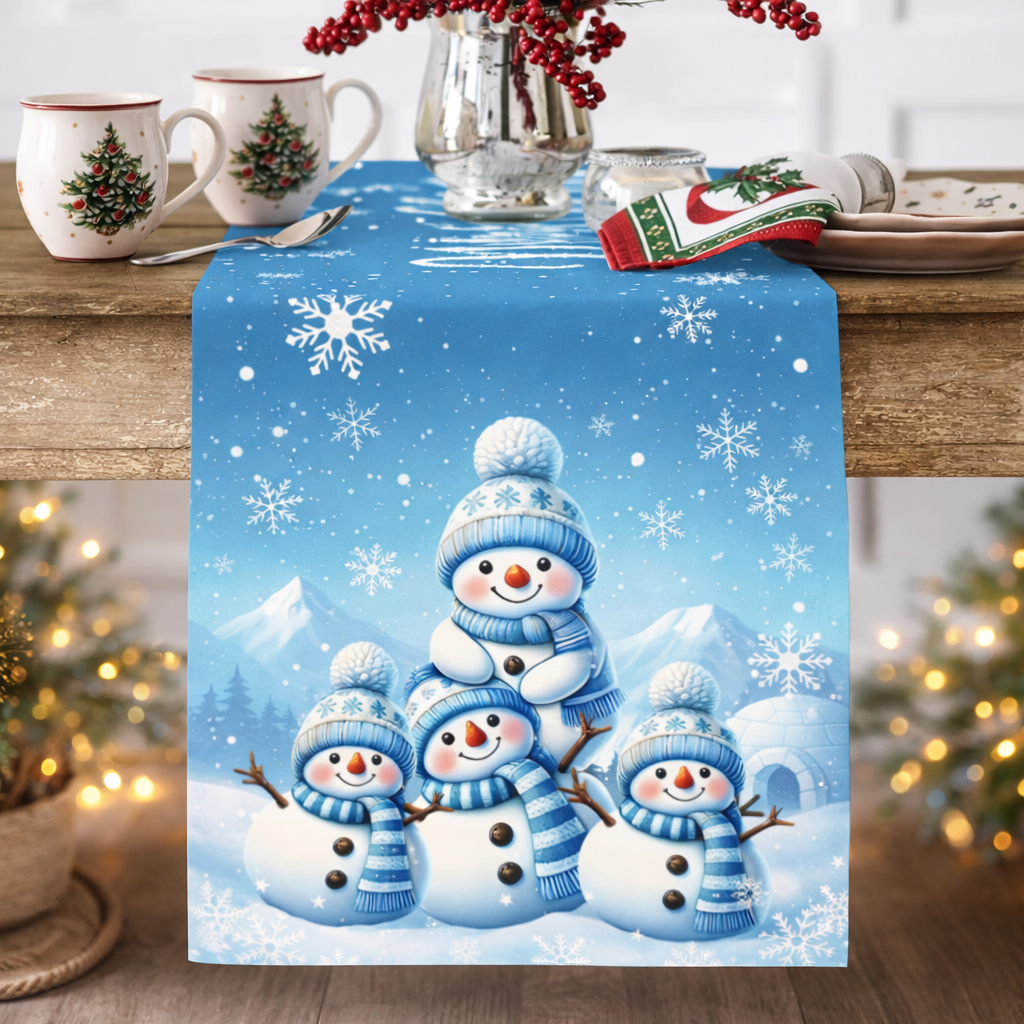 Featuring an adorable snowman family and soft winter colors, this table runner brings a warm and joyful holiday feeling to every meal.